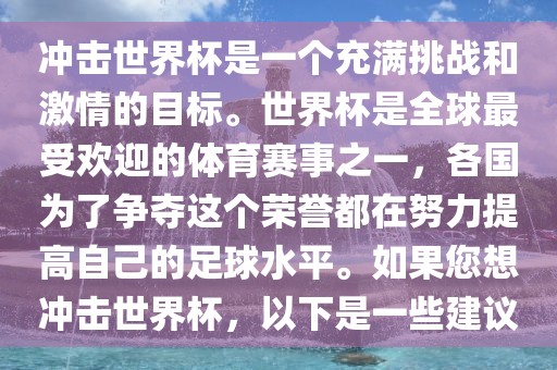冲击世界杯是一个充满挑战和激情的目标。世界杯是全球最受欢迎的体育赛事之一,各国为了争夺这个荣誉都在努力提高自己的足球水平。如果您想冲击世界杯,以下是一些建议