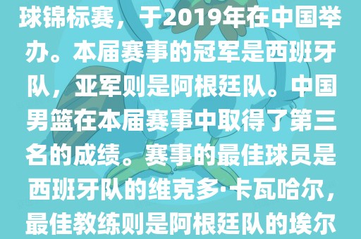 摘要:2019年国际篮联篮球世界杯在中国举办,西班牙队夺得冠军,中国男篮取得第三名。最佳球员为西班牙队的维克多·卡瓦哈尔,最佳教练为阿根廷队的埃尔南多·贝拉斯科。本届赛事创造了多项纪录,包括观众人数超过全球电视观众人数等。