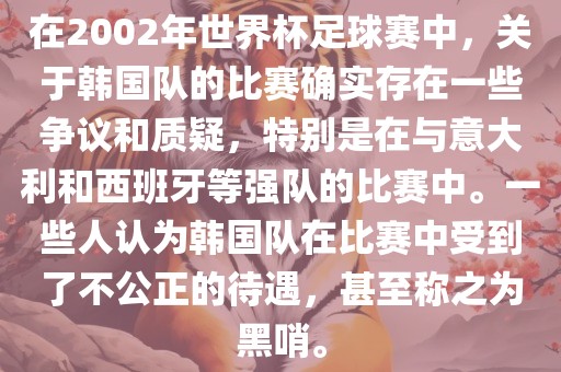 在2002年世界杯足球赛中,关于韩国队的比赛确实存在一些争议和质疑,特别是在与意大利和西班牙等强队的比赛中。一些人认为韩国队在比赛中受到了不公正的待遇,甚至称之为黑哨。