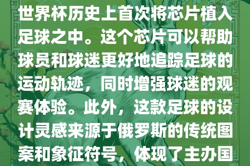 俄罗斯世界杯的官方用球名为Telstar 18。这款足球在设计上采用了全新的方式,其表面使用了全新的NFC芯片,这是世界杯历史上首次将芯片植入足球之中。这个芯片可以帮助球员和球迷更好地追踪足球的运动轨迹,同时增强球迷的观赛体验。此外,这款足球的设计灵感来源于俄罗斯的传统图案和象征符号,体现了主办国俄罗斯的文化特色。在比赛期间,这款足球凭借其卓越的性能和独特的外观赢得了广泛的好评。