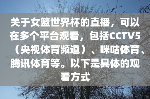 关于女篮世界杯的直播,可以在多个平台观看,包括CCTV5(央视体育频道)、咪咕体育、腾讯体育等。以下是具体的观看方式