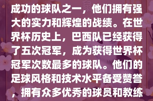 巴西足球队是世界杯历史上最成功的球队之一,他们拥有强大的实力和辉煌的战绩。在世界杯历史上,巴西队已经获得了五次冠军,成为获得世界杯冠军次数最多的球队。他们的足球风格和技术水平备受赞誉,拥有众多优秀的球员和教练。