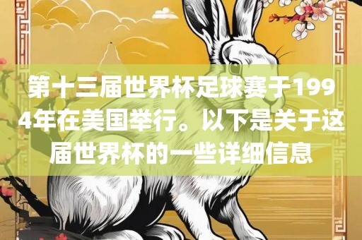 第十三届世界杯足球赛于1994年在美国举行。以下是关于这届世界杯的一些详细信息