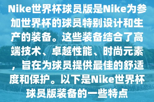 Nike世界杯球员版是Nike为参加世界杯的球员特别设计和生产的装备。这些装备结合了高端技术、卓越性能、时尚元素,旨在为球员提供最佳的舒适度和保护。以下是Nike世界杯球员版装备的一些特点