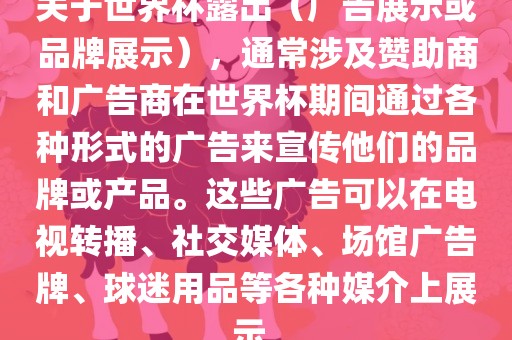 关于世界杯露出(广告展示或品牌展示),通常涉及赞助商和广告商在世界杯期间通过各种形式的广告来宣传他们的品牌或产品。这些广告可以在电视转播、社交媒体、场馆广告牌、球迷用品等各种媒介上展示。