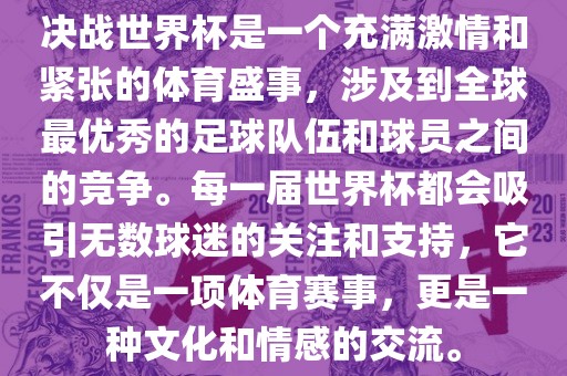 决战世界杯是一个充满激情和紧张的体育盛事,涉及到全球最优秀的足球队伍和球员之间的竞争。每一届世界杯都会吸引无数球迷的关注和支持,它不仅是一项体育赛事,更是一种文化和情感的交流。