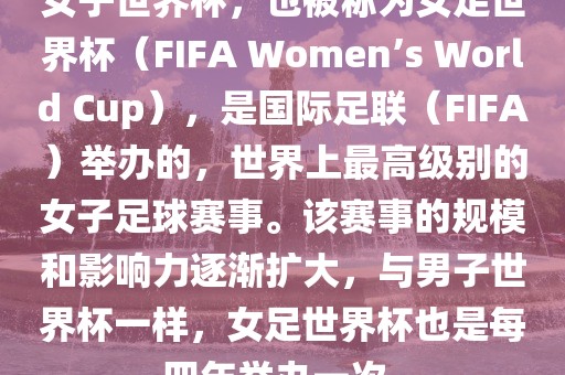 女子世界杯,也被称为女足世界杯(FIFA Women’s World Cup),是国际足联(FIFA)举办的,世界上最高级别的女子足球赛事。该赛事的规模和影响力逐渐扩大,与男子世界杯一样,女足世界杯也是每四年举办一次。