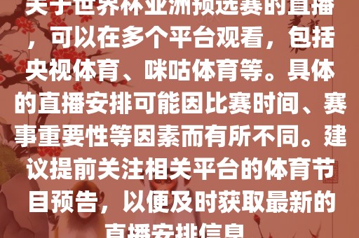 关于世界杯亚洲预选赛的直播,可以在多个平台观看,包括央视体育、咪咕体育等。具体的直播安排可能因比赛时间、赛事重要性等因素而有所不同。建议提前关注相关平台的体育节目预告,以便及时获取最新的直播安排信息。