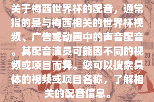 摘要:关于梅西在世界杯相关的视频、广告或动画中的配音,其配音演员因不同项目而异。这些配音内容通常与梅西在世界杯上的表现相关,为观众带来更加生动的视听体验。要获取具体的配音信息,可以通过搜索相关视频或项目名称来了解。