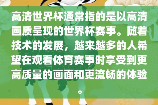 高清世界杯通常指的是以高清画质呈现的世界杯赛事。随着技术的发展,越来越多的人希望在观看体育赛事时享受到更高质量的画面和更流畅的体验。